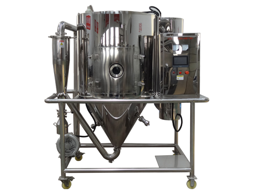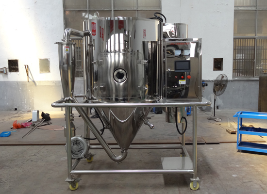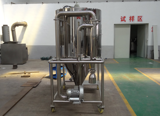 空氣經(jīng)過(guò)濾和加熱,進(jìn)入干燥器頂部空氣分配器,熱空氣呈螺旋狀均勻地進(jìn)入干燥室。料液經(jīng)塔體頂部的高速離心霧化器,(旋轉(zhuǎn))噴霧成極細(xì)微的霧狀液珠,與熱空氣并流接觸在極短的時(shí)間內(nèi)可干燥為成品。成品連續(xù)地由干燥塔底部和旋風(fēng)分離器中輸出,廢氣由風(fēng)機(jī)排空。